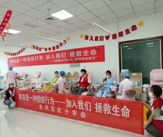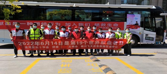 为庆祝世界献血者日活动,2022年6月14日上午9时,金凤区红十字会和银川飞天救援促进中心志愿者近20人在宁夏血液中心一楼参加“庆祝第19个世界献血者日暨宁夏无偿献血科普馆开馆活动”启动仪式。