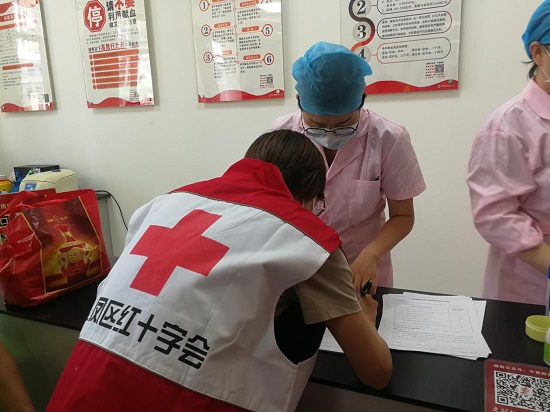 金凤区红十字会志愿者赫永海带领刚参加完高考的女儿和其他志愿者来到宁夏血液中心二楼采血室积极填写信息表,为爱伸出援手,捐献出热血,成为一名光荣的无偿献血志愿者!