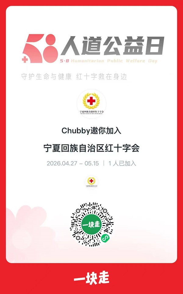市民朋友们,公益无需远行,善行就在脚下。请您主动参与,迈出公益第一步。让我们携手并肩,以步传爱,以行践善,用爱心温暖宁夏,共同为困难家庭撑起一片温暖的天空,让“人道、博爱、奉献”的红十字精神在塞上大地绽放出更加耀眼的光芒!