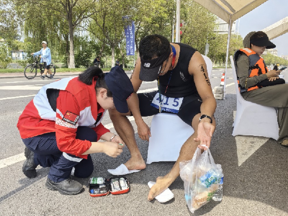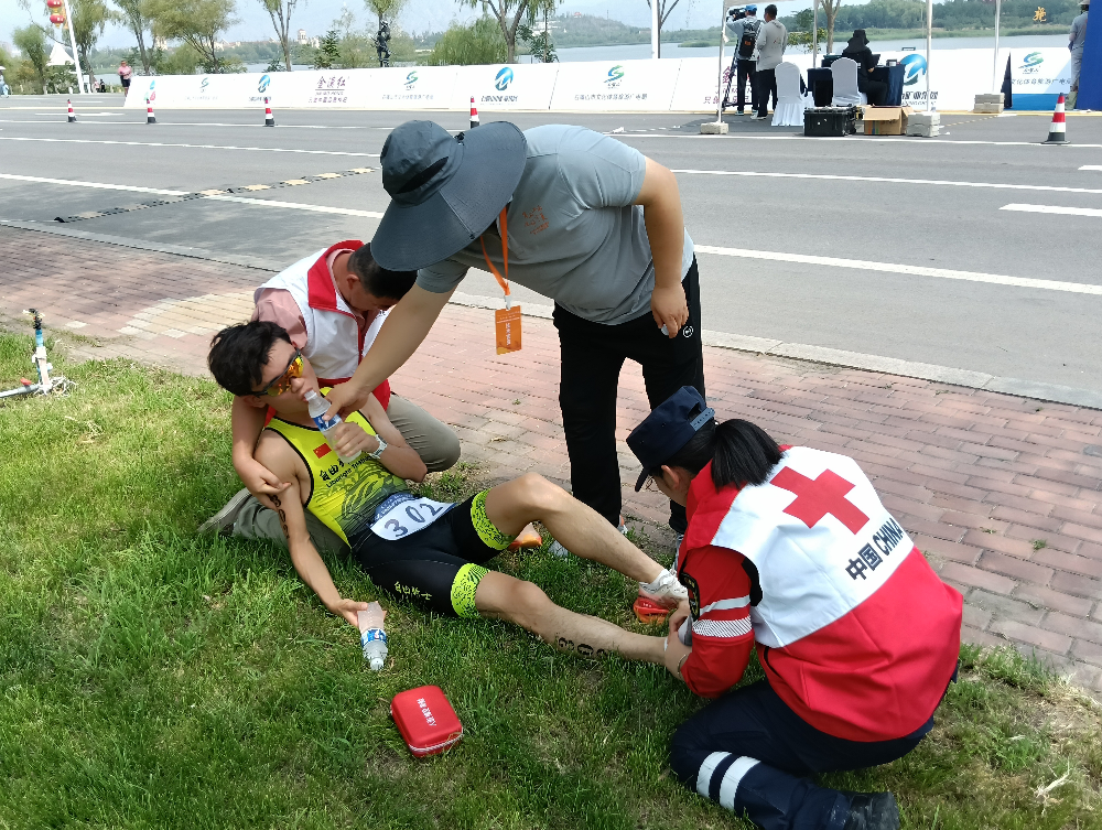 赛事期间,市红十字会应急救护师资在岸边、自行车道、跑道等各个医疗站点,全程参与赛事应急保障,并配备有急救包、自动体外除颤仪(AED),师资们时刻关注参赛者状态,为身体不适的选手提供及时有效的服务。据统计,一上午赛事共处理双脚磨破1例,小腿抽筋1例,以及提供皮肤外伤消毒包扎、冰敷等保障服务,并进行了心理抚慰和关怀;另外对赛后需要调整的选手及时修复拉伸,以专业的技能和用心的细节圆满完成了各项保障任务,受到参赛者们的热情关注和普遍好评。
