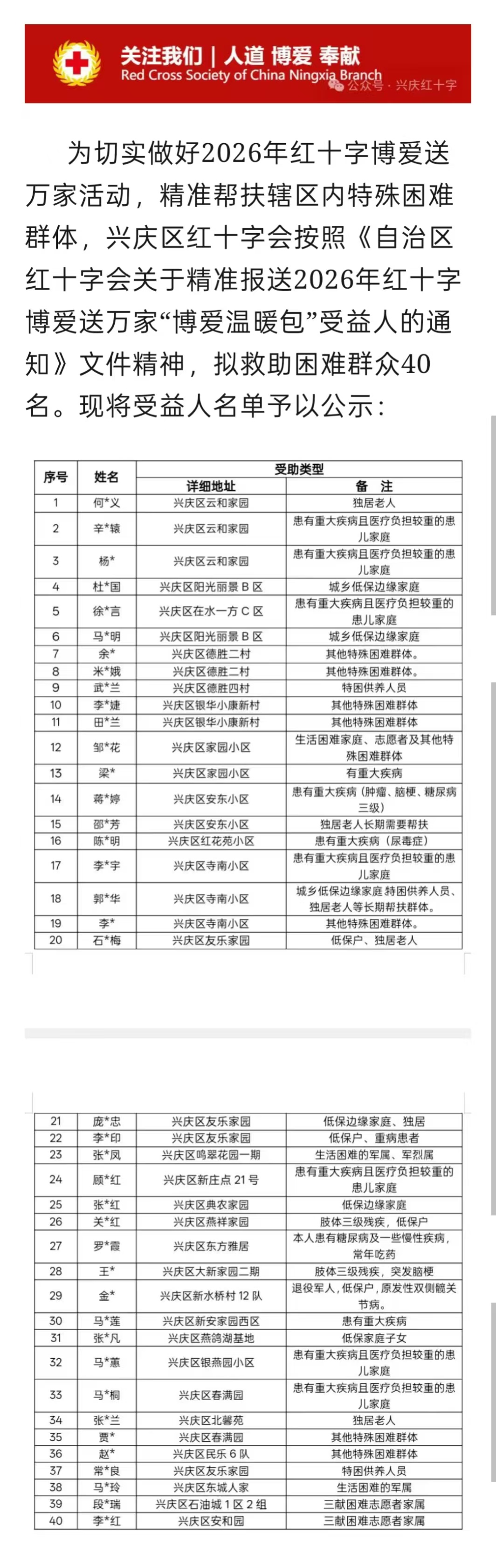 兴庆区红十字会关于2026年红十字博爱送万家“博爱温情包”受益人的公示