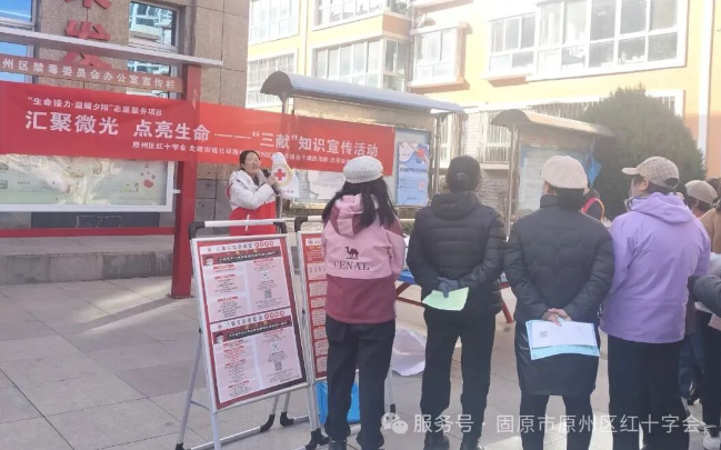 为深入普及“三献”(无偿献血、造血干细胞捐献、人体器官捐献)知识,弘扬“人道、博爱、奉献”的红十字精神,提升社区群众对红十字事业的认可。11月13日,原州区博福爱心服务中心红十字会联合原州区红十字造血干细胞捐献(无偿献血)志愿服务队在北塬街道北环路社区开展了“汇聚微光 点亮生命”——“三献”知识宣传志愿服务活动。
