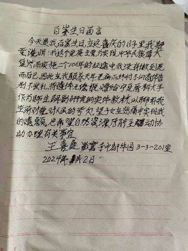 2025年12月14日16时23分,102岁离休老干部、老党员王喜庭同志安详离世,遵照其生前遗嘱,家属配合宁夏红十字会完成遗体捐献手续,将老人遗体移交给宁夏医科大学用于临床教学,以生命最后的奉献诠释党员担当,用无私大爱为塞上大地续写温暖篇章。王喜庭同志一生初心如磐、深耕奉献,履历里满是对党和人民事业的赤诚坚守。早年,他以教师身份深耕讲台,播撒知识火种,用责任与耐心点亮无数学生的成长之路;他响应国家号召,毅然奔赴宁夏,投身测绘领域工作,深耕地质勘查、资源保护等重点工作,攻克多项行业难题,用实干为宁夏国土资源事业高质量发展筑牢基础。即便年岁渐高,王喜庭同志始终牢记党员身份,心系公益、胸怀大爱。在100岁生日这一特殊时刻,他郑重留下遗嘱,明确表达去世后捐献遗体供医学教学的意愿,叮嘱子女尽快联系宁夏红十字会办理相关手续。子女遵照老人嘱托,邀请红十字会工作人员上门。在家人陪伴下,老人清晰、坚定地完成遗体捐献意愿登记,用行动敲定了这份跨越生命的“爱心约定”。老人离世后,在宁夏红十字会的协调对接下,将其遗体顺利移交宁夏医科大学,用于医学人才培养与临床教学实践,为医学领域攻克难题、提升诊疗水平提供助力。王喜庭同志以另一种方式延续生命价值,让“奉献”二字在生命尽头绽放璀璨光芒,也彰显了一名老党员的高尚品格与人道情怀。