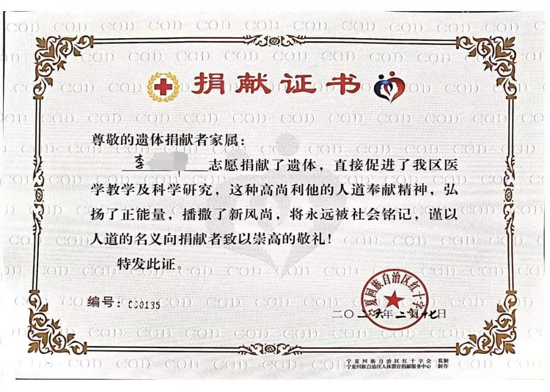 在人生的最后阶段,李老做出了一个让所有人动容的决定——无偿捐献自己的遗体和眼角膜。“我这辈子都在和医学打交道,知道遗体捐献对医学研究有多重要,眼角膜能让别人重见光明,这是我能做的最后一点贡献了。”李老在弥留之际说出了自己的心愿。这一善举,也得到了家属们一致的理解、支持与配合。李老家人也以同样的善意,助力老人完成了最后的心愿。李老捐献的眼角膜已成功让两名眼疾患者重见光明。