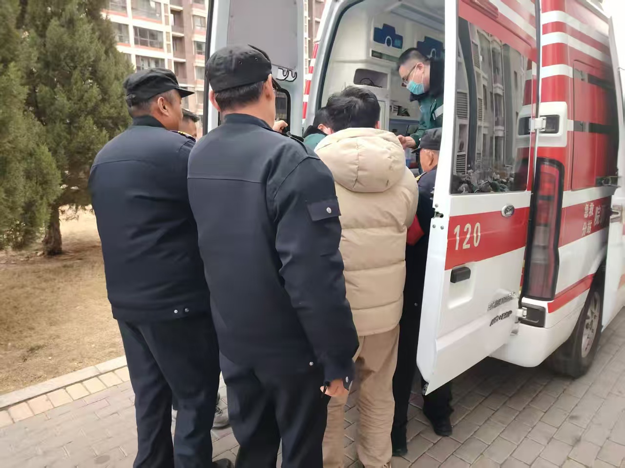 等待120救护车期间,应急团队全程守在老人身边,密切监测其身体状态。数分钟后,救护车在专人引导下精准停靠楼栋,应急人员配合医护清理通行障碍、平稳将老人转移至担架,全程衔接顺畅。