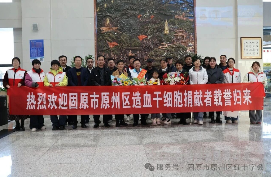 3月21日,市、区红十字会组织志愿者、部分监事理事和捐献者的亲友前往固原机场,热烈欢迎造血干细胞捐献者郭先生载誉归来。