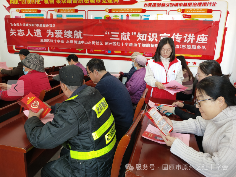 11月12日至13日,原州区红十字会在北塬街道中山北街社区和北环路社区开展以“矢志人道 为爱续航”和“汇聚微光 点亮生命”为主题的“三献”知识宣传志愿服务活动,社区群众40余人参加,发放宣传资料100余份。