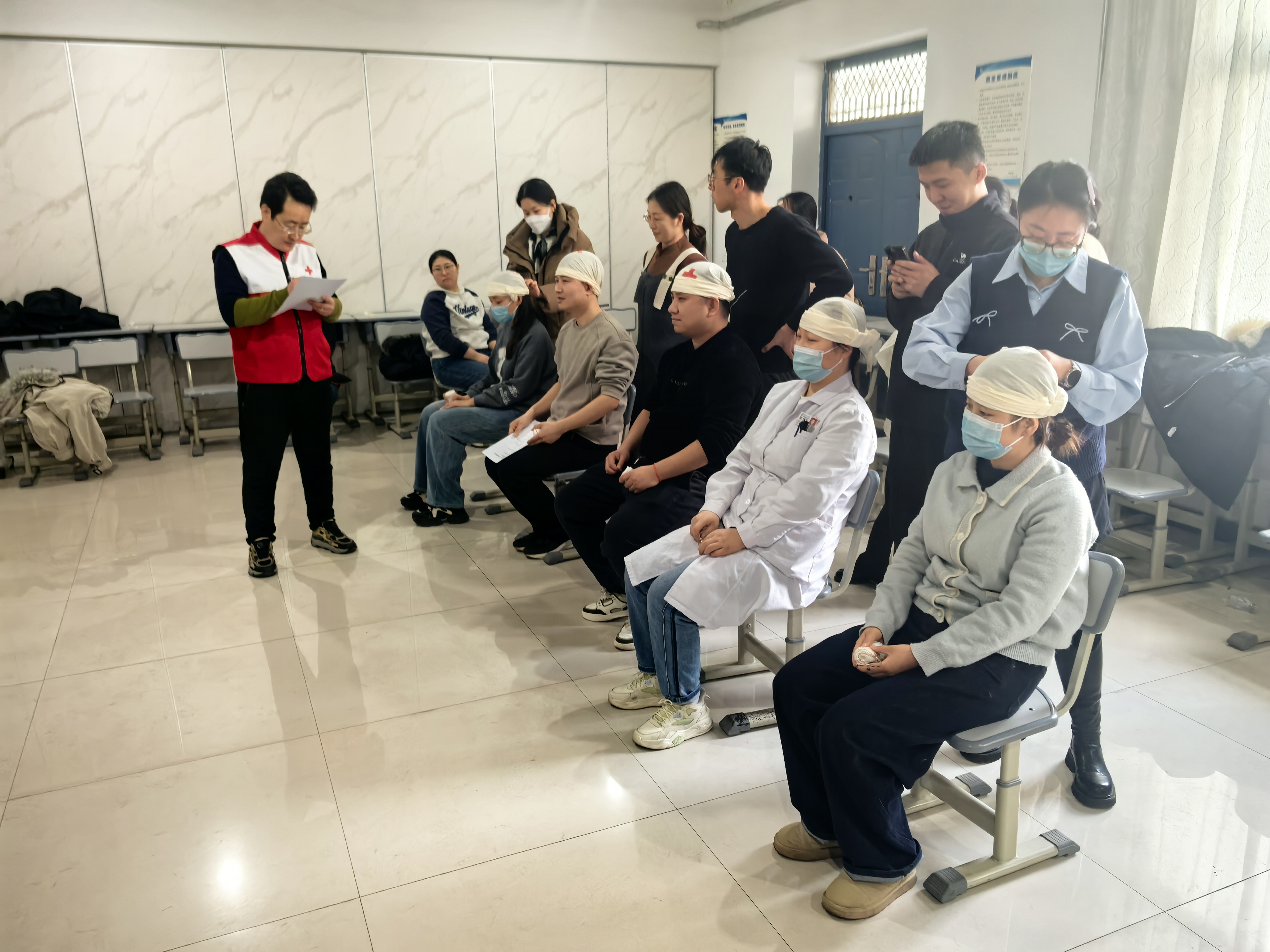 本次培训立足医学专业背景与临床急救需求,构建“理论赋能+实操淬炼”双轨教学体系。理论教学紧扣红十字知识、三救三献内容,融合医学理念,系统讲授心肺复苏(CPR)、自动体外除颤器(AED)精准操作、气道异物梗阻海姆立克急救、创伤止血包扎与骨折固定等核心知识,深入解析“黄金4分钟”急救时效逻辑,强化急救决策与风险预判能力。实操环节采用“示范引领+分组实操+精准纠错”模式,聚焦按压深度、频率、通气比例、包扎固定规范等关键技术细节,通过反复演练将理论知识转化为标准化操作技能,确保急救动作精准、高效、规范。